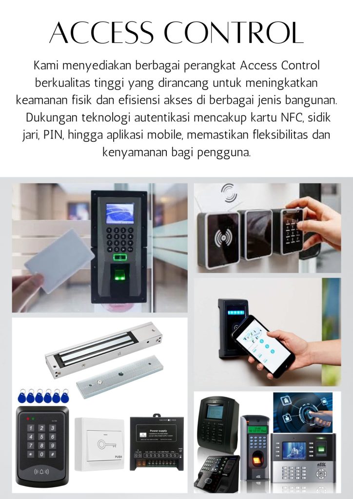 Sistem kontrol akses modern untuk mengatur keluar-masuk orang secara efisien dan aman di berbagai titik lokasi.